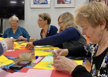 Еще один мастер-класс был посвящен изготовлению открытки в технике айрис-фолдинг, который очень увлек участников клуба. Они узнали, что айрис-фолдинг — аппликация, которая рождается при складывании картинки из кусочков разноцветной бумаги. Техника раскладки композиции на множество цветовых составляющих позволила «Старшим» проявить творческую индивидуальность и увидеть необычное в простых предметах.