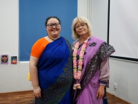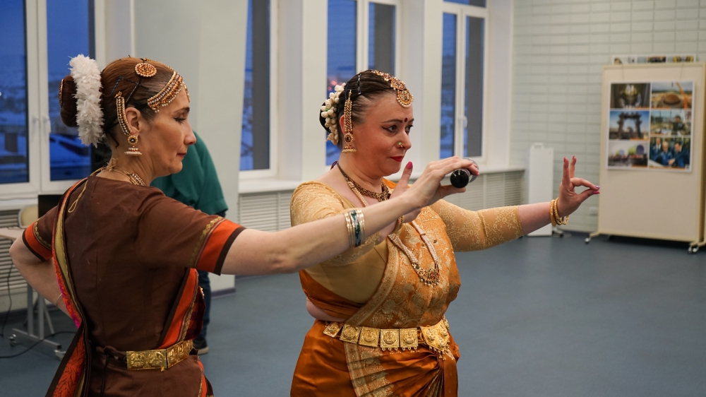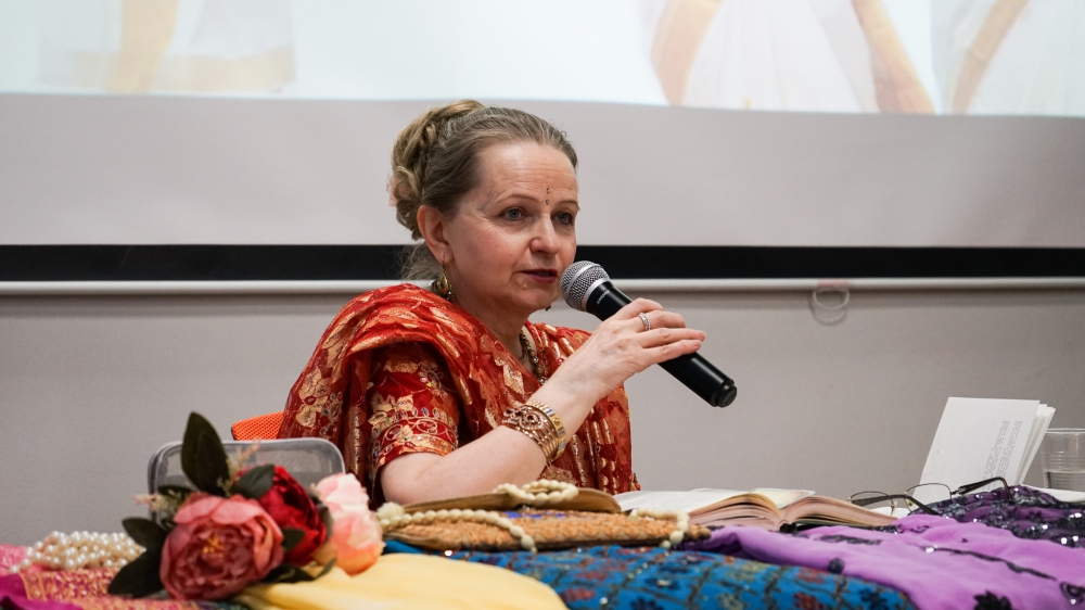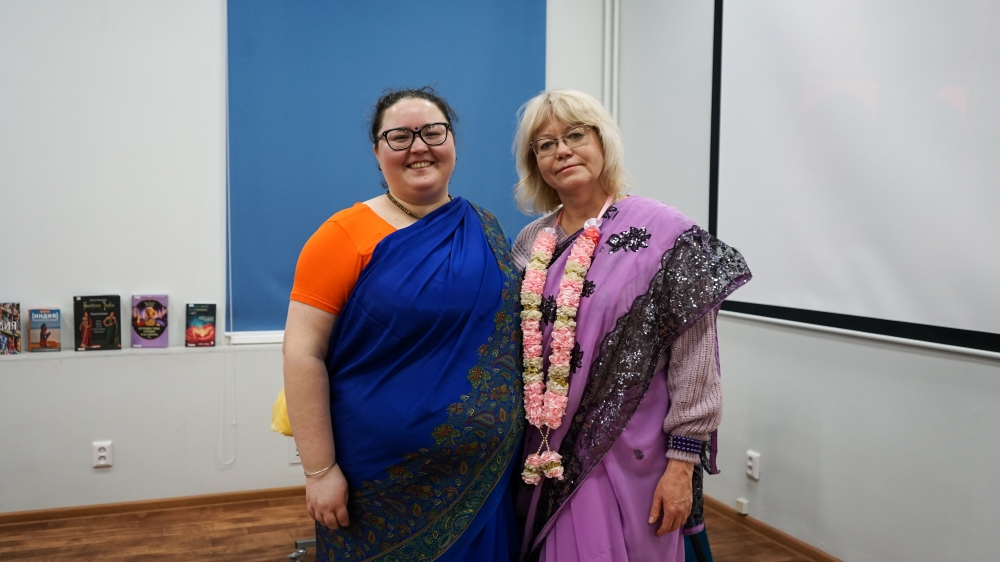 В рамках лекции «Сари: древнее, загадочное, женственное» сотрудники Центра ведической культуры в Мурманске Евгения Маркина и Ольга Куракина рассказали об истории и особенностях ношения сари. После мероприятия прошел мастер-класс по надеванию этой национальной одежды Индии.