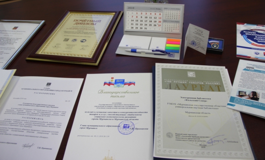 Мурманская областная научная библиотека стала победителем регионального конкурса «Лучшие товары и услуги Мурманской области 2018 года» и федерального этапа конкурса «100 лучших товаров России» 2018 года в номинации «Услуги для населения», представив комиссии по качеству Электронную библиотеку «Кольский Север».