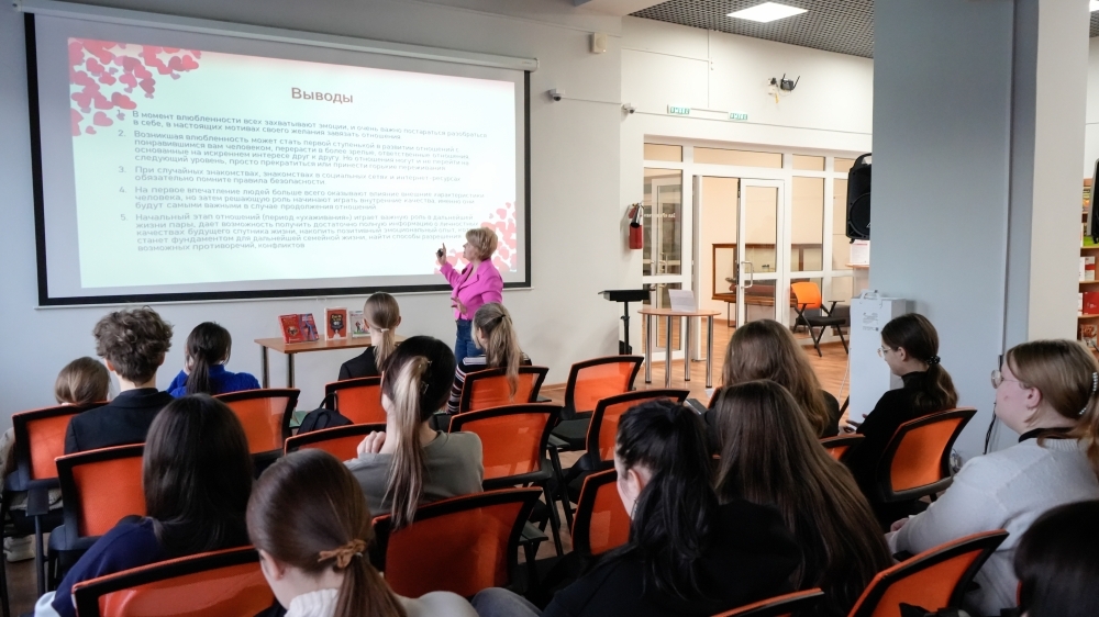 В январе 2025 года стартовал проект отдела библиотечного обслуживания «Счастливая семья». В рамках проекта 23 января специально для учащихся 10-ого класса гимназии № 5 был проведен обзор изданий с презентацией под названием «Учимся дружить и любить: выбор спутника жизни». Специалист библиотеки Любовь Кочергина представила книги с одноименной выставки в зале «Развитие».