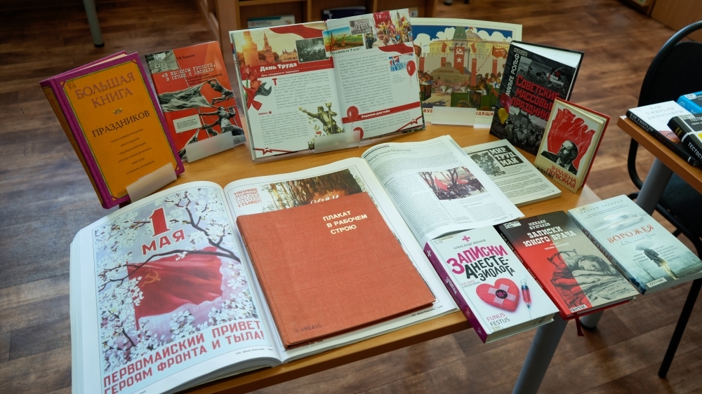 Выставка изданий «Здравствуй, Первомай!» представила издания об истории, становлении и развитии праздника 1 Мая и о героях разных профессий в художественной литературе.
