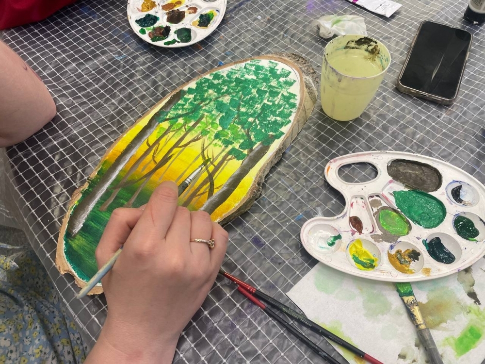 7 июня на мастер-классе «Жизнь леса» в зале искусств собрались любители рисования акрилом. Теплый вечер идеально подошёл для создания необычной работы на спиле натурального дерева.