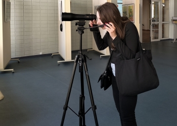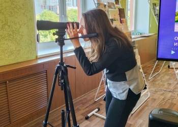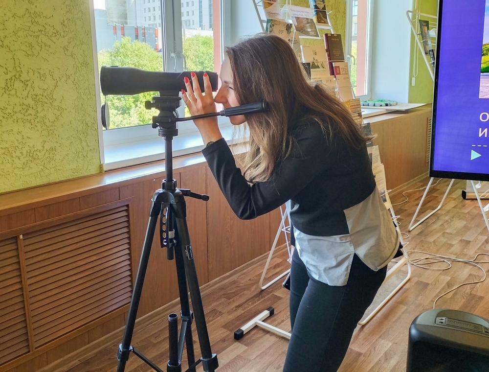 В завершении экскурсии ее участники увлеченно рассматривали здания и памятники в подзорную трубу с высоты четвертого этажа библиотеки.