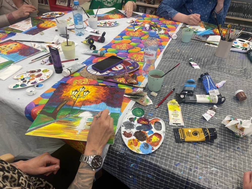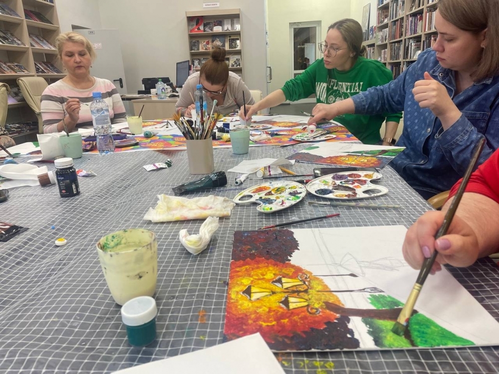 С помощью ярких акриловых красок получилось создать настоящее произведение искусства. Участники нарисовали яркий осенний пейзаж и получили уникальный опыт работы с акрилом, освоили различные приемы рисования по мотивам работ художника Л. Афремова. Вместе с Анастасией Худяковой, сотрудником отдела информации по культуре и искусству, они прошли по всем этапам создания уникального изделия, научились новому и создали своими руками прекрасную картину.