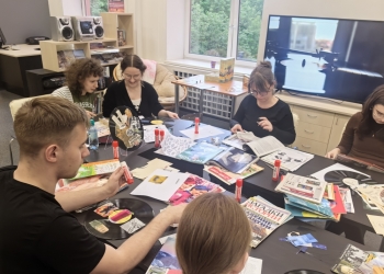 С помощью ярких журнальных вырезок получилось создать настоящее произведение современного искусства. Участники получили уникальный опыт работы с винилом, освоили различные приемы в технике коллаж. Вместе с Юлией Шоховой, сотрудником отдела информации по культуре и искусству, они прошли по всем этапам создания уникального произведения искусства, научились новому и создали своими руками прекрасную работу.