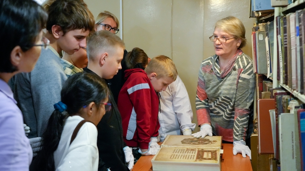Участники экскурсии вместе со специалистом отдела библиотечного обслуживания Еленой Кузнецовой перелистнули страницы старопечатного «Евангелия» 1753 года, услышали рассказ об истории создания этой богослужебной книги и особенностях ее оформления.