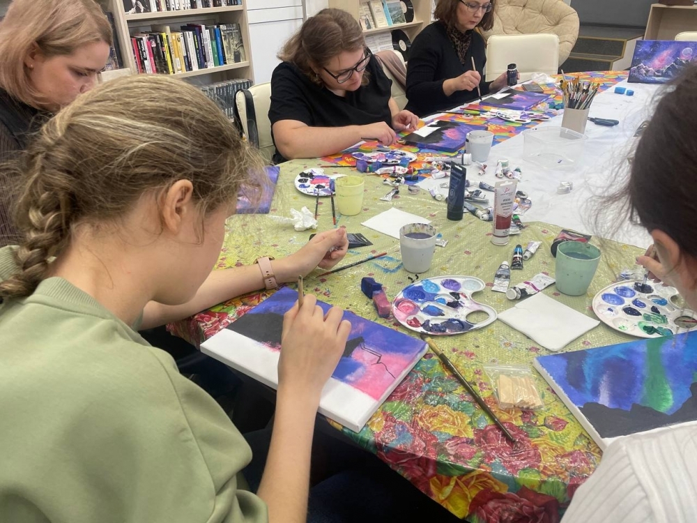 С помощью ярких акриловых красок получилось создать настоящее произведение искусства. Участники нарисовали ночной горный пейзаж и получили уникальный опыт работы с акрилом, освоили различные приемы рисования. Вместе с Анастасией Худяковой, сотрудником отдела информации по культуре и искусству, они прошли все этапы создания уникального изделия, научились новому и создали своими руками прекрасную картину.