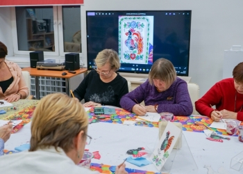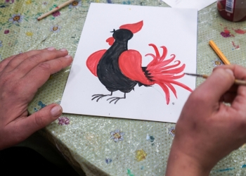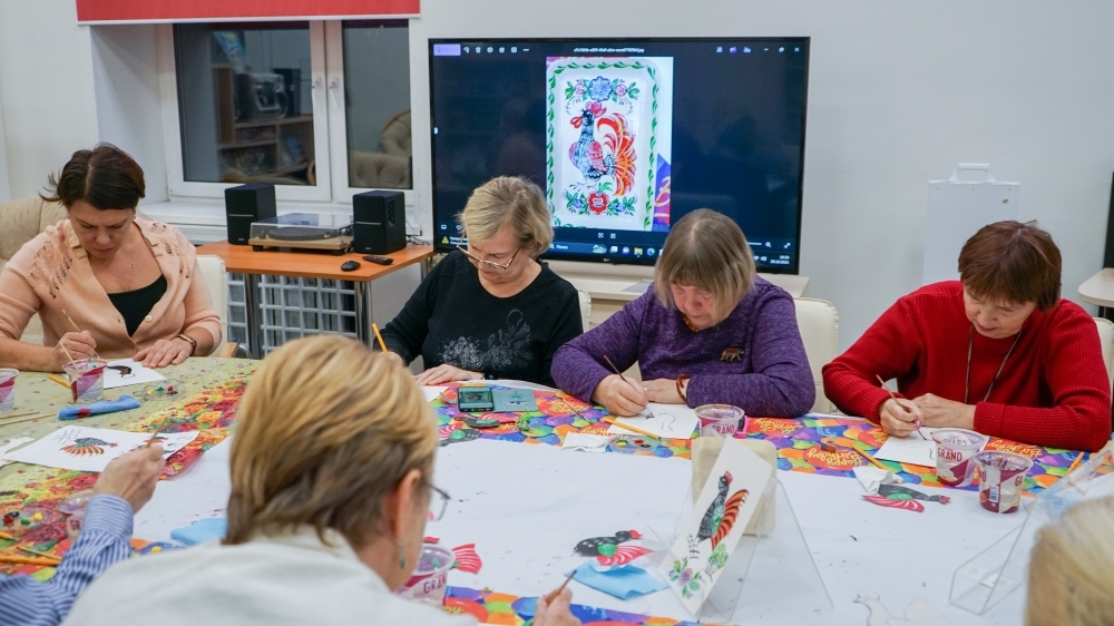 Посетители мастер-класса познакомились с техникой и особенностями городецкой росписи, освоили навыки и приемы этого вида живописи, нарисовали стильного и каноничного «городецкого петушка».