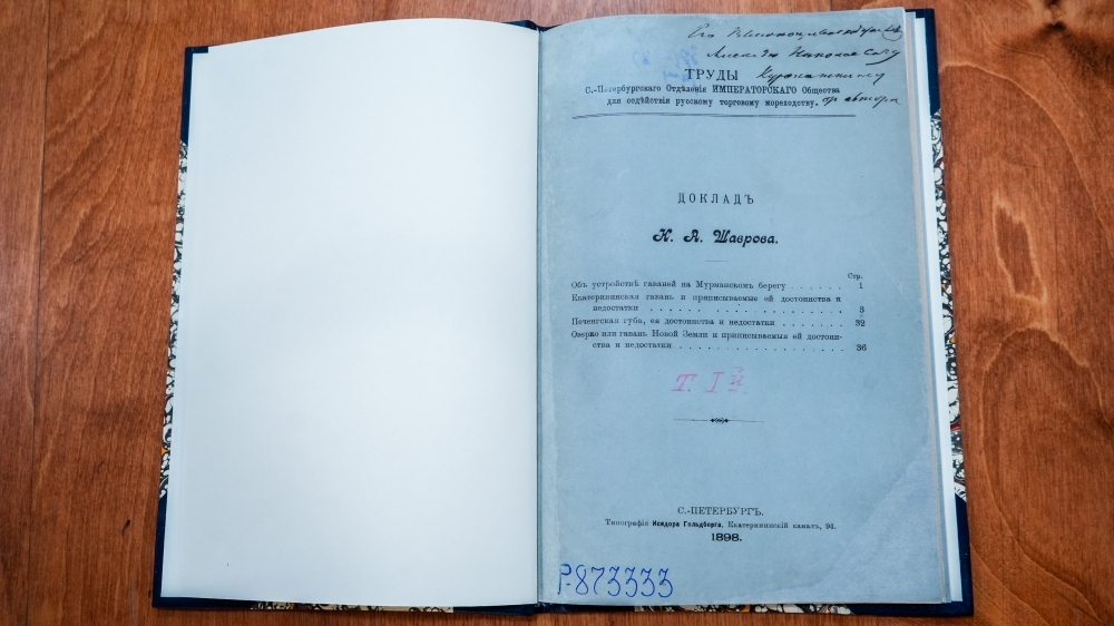 Одна из отреставрированных книг, включающая текст доклада Н. А. Шаврова об устройстве гаваней на Мурмане, ранее хранилась в библиотеке военного министра, историка, члена Русского географического общества Алексея Николаевича Куропаткина (1848–1925). На обложке нашего экземпляра имеются штемпель «Библiотека А. Н. Куропаткина» и дарственная надпись «Его высокопревосходительству Алексею Николаевичу Куропаткину от автора».