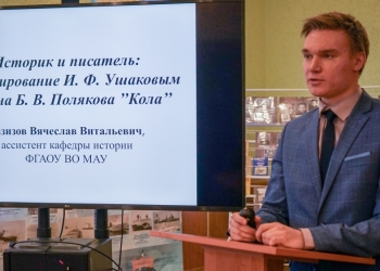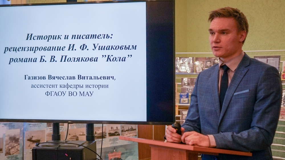 Ассистент кафедры истории МАУ Вячеслав Витальевич Газизов выступил с темой «Историк и писатель: рецензирование И. Ф. Ушаковым романа Б. В. Полякова “Кола”».