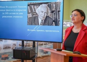 Начальник отдела научно-справочного аппарата и информационного обеспечения Государственного архива Мурманской области Светлана Владимировна Такашова представила выступление по теме «Биография Ивана Федоровича Ушакова в десяти фотографиях». Она рассказала о главных вехах жизни ученого.