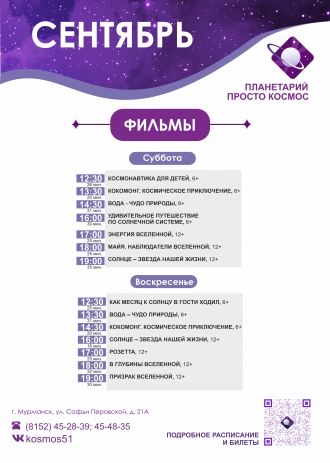 - постоянно пополняющаяся библиотека ярких фильмов в специальном формате FullDome, гарантирующем эффект полного погружения зрителей в повествуемые события (продолжительность фильмов от 35 до 50 минут);