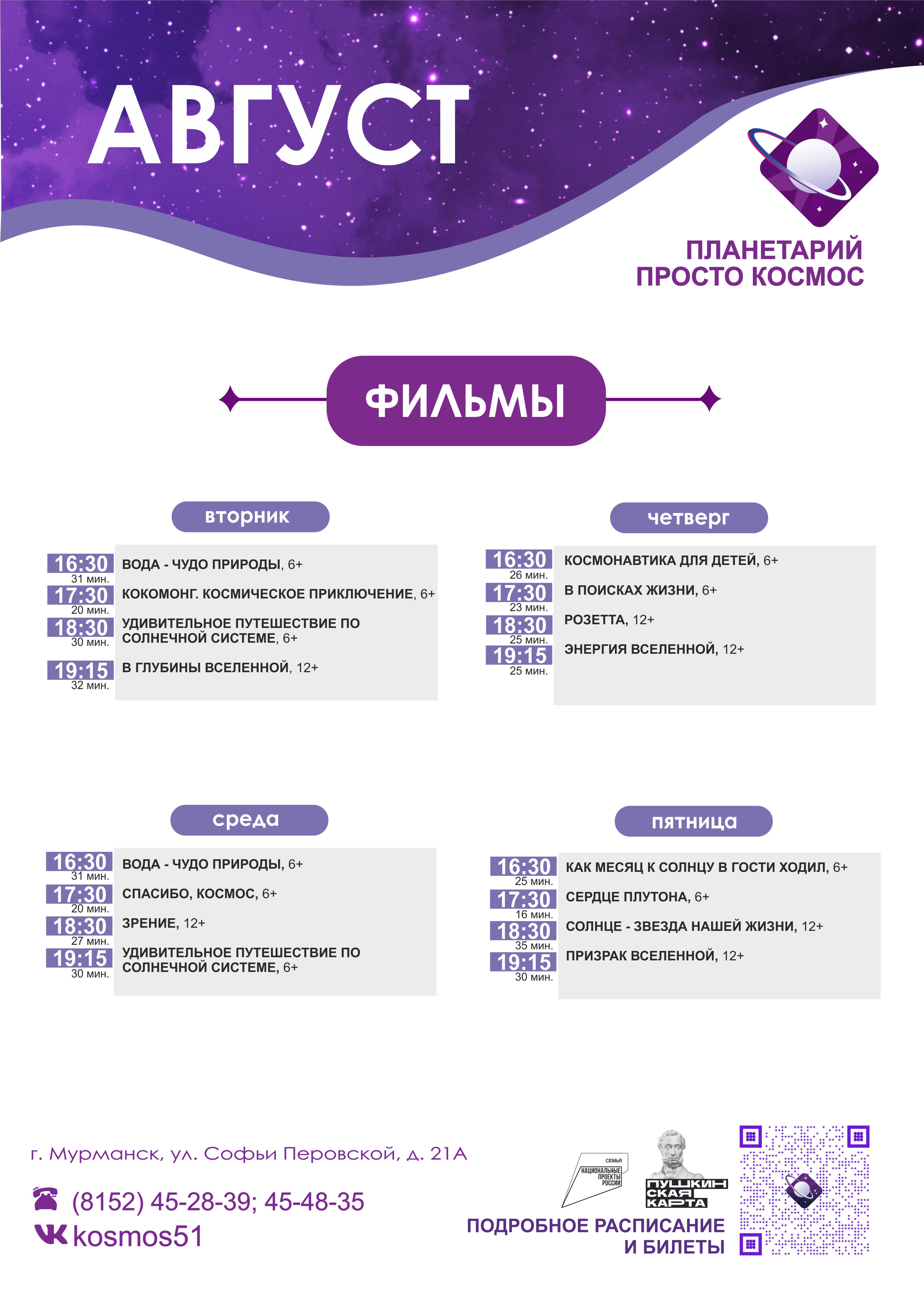 - постоянно пополняющаяся библиотека ярких фильмов в специальном формате FullDome, гарантирующем эффект полного погружения зрителей в повествуемые события (продолжительность фильмов от 35 до 50 минут);