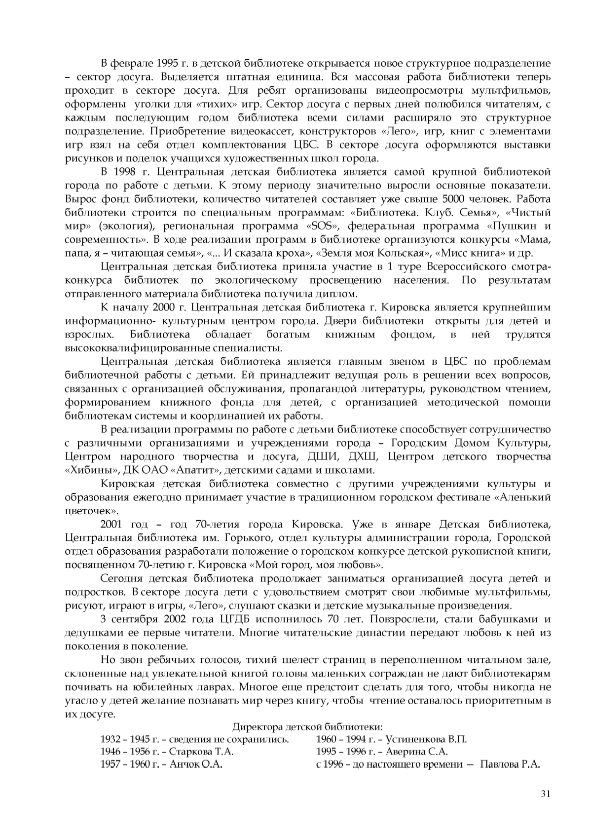 К началу 2000 г. Центральная детская библиотека г. Кировска является крупнейшим