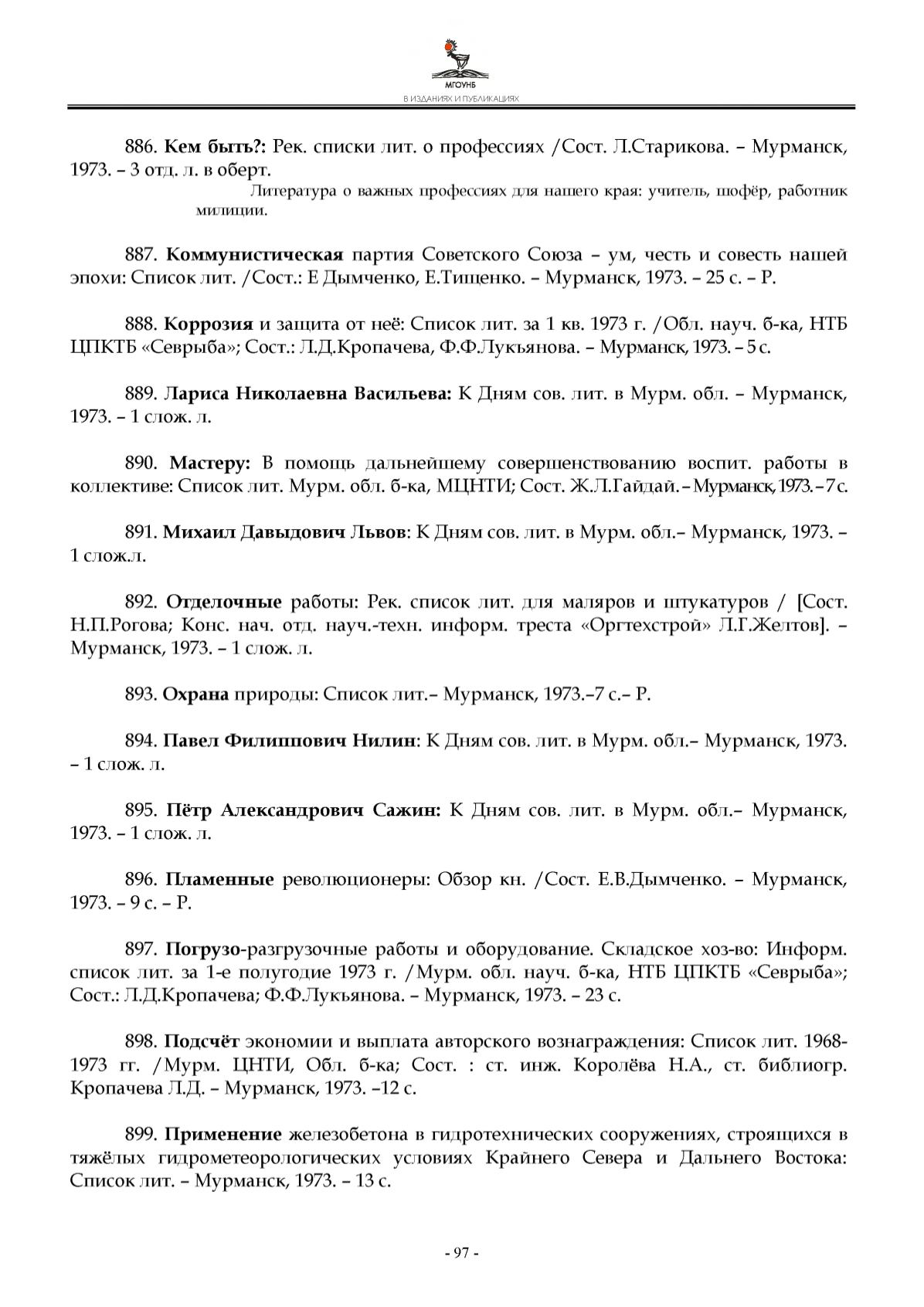 1 9 7 3 гг. /М у р м . Ц Н ТИ , О бл . б -к а ; С о с т . : ст. инж . К ор ол ёв а Н .А ., ст. би бли о гр .