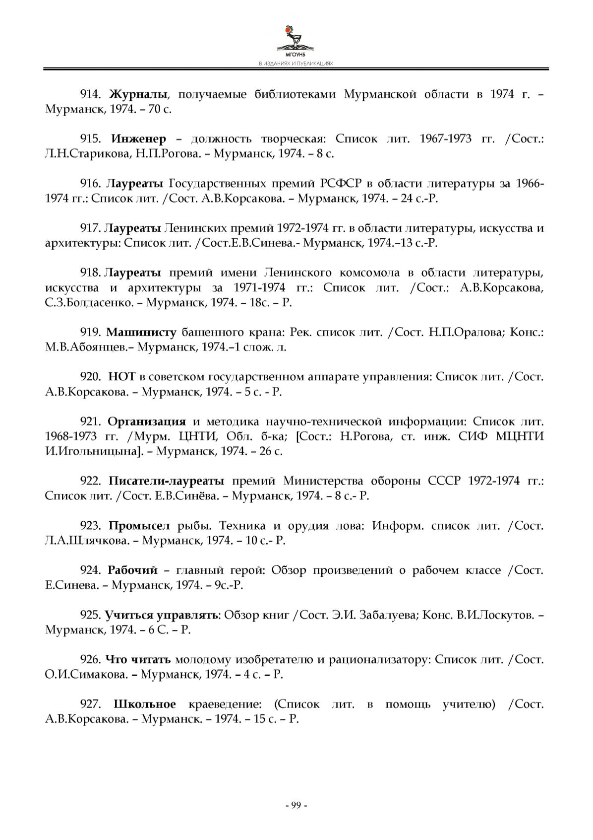 1 9 7 4 гг.: С п и со к лит . / С о с т . А .В .К о р с ак о в а . - М урм ан ск , 1 9 7 4 . - 2 4 с .-Р .