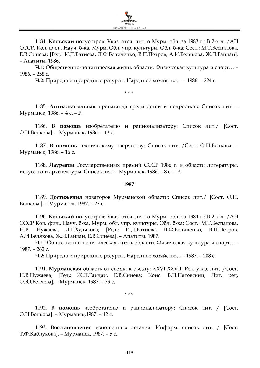 СССР Кол. фил., Науч. б-ка, Мурм. обл. упр. культуры, Обл. б-ка; Сост.: М.Т.Беспалова,