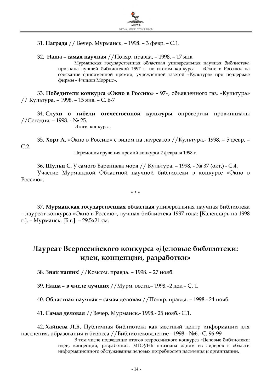 признана лучшей библиотекой 1997 г. по итогам конкурса