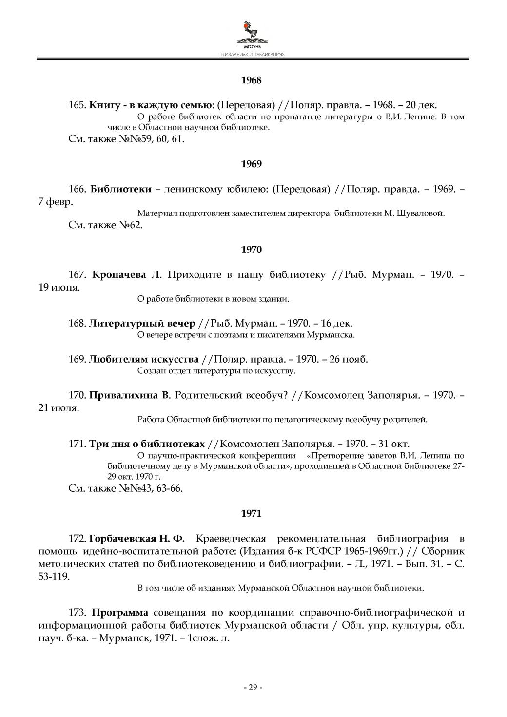 167. Кропачева Л. Приходите в нашу библиотеку //Рыб. Мурман. - 1970. -