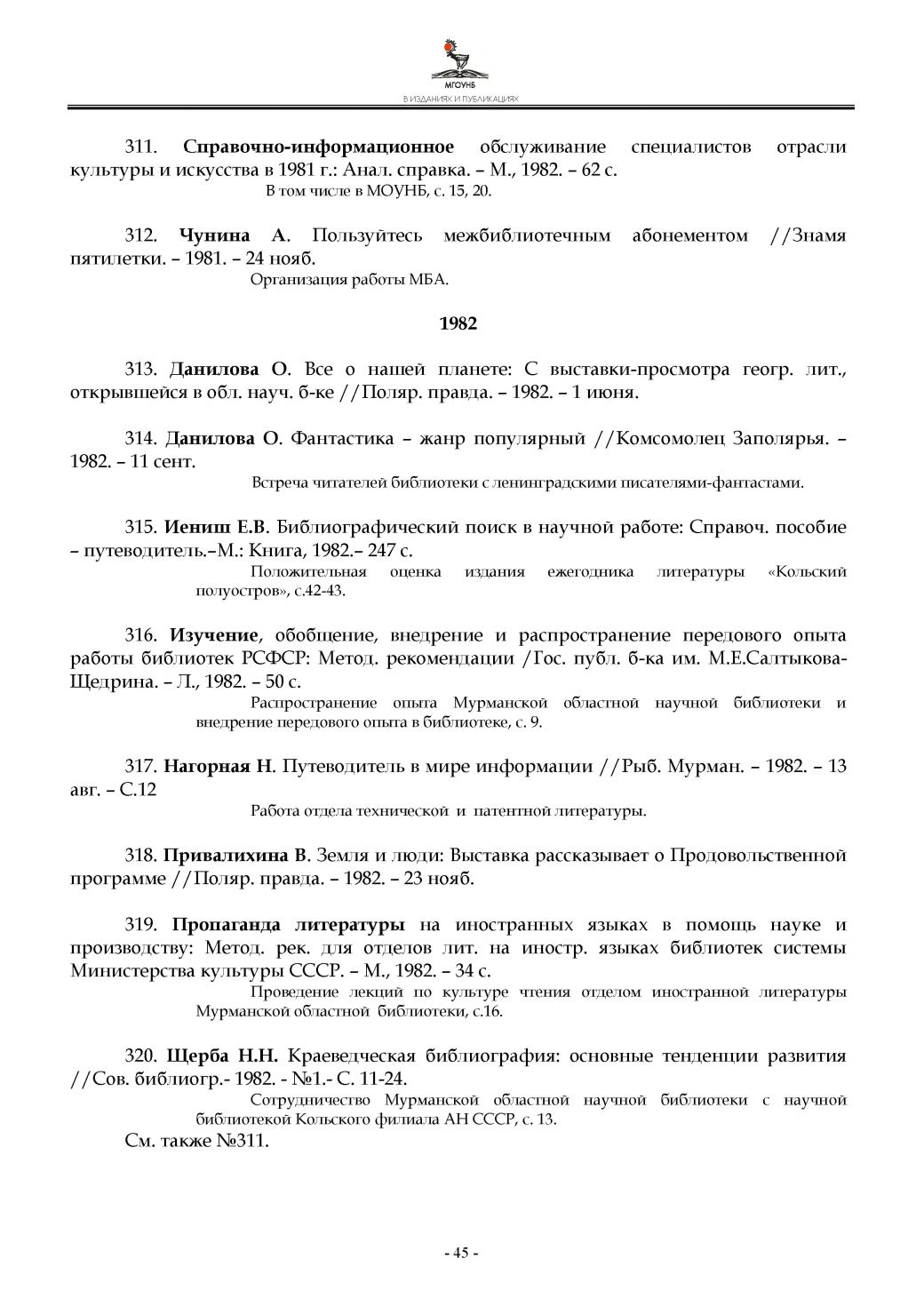 317. Нагорная Н. Путеводитель в мире информации //Рыб. Мурман. - 1982. - 13