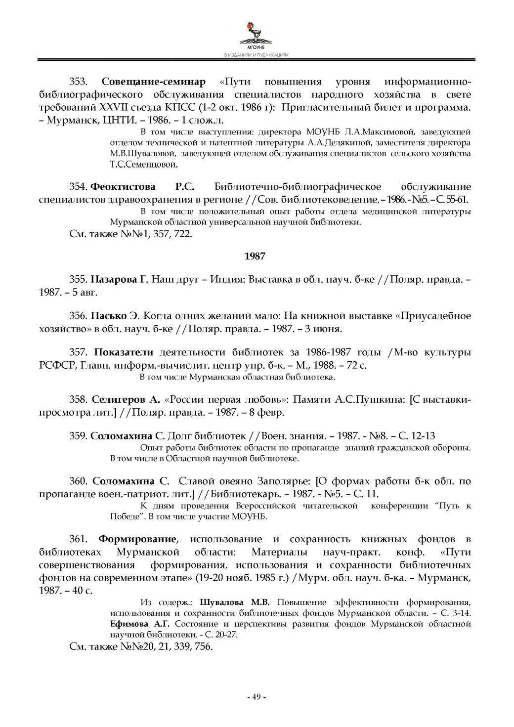360. Соломахина С. Славой овеяно Заполярье: [О формах работы б-к обл. по