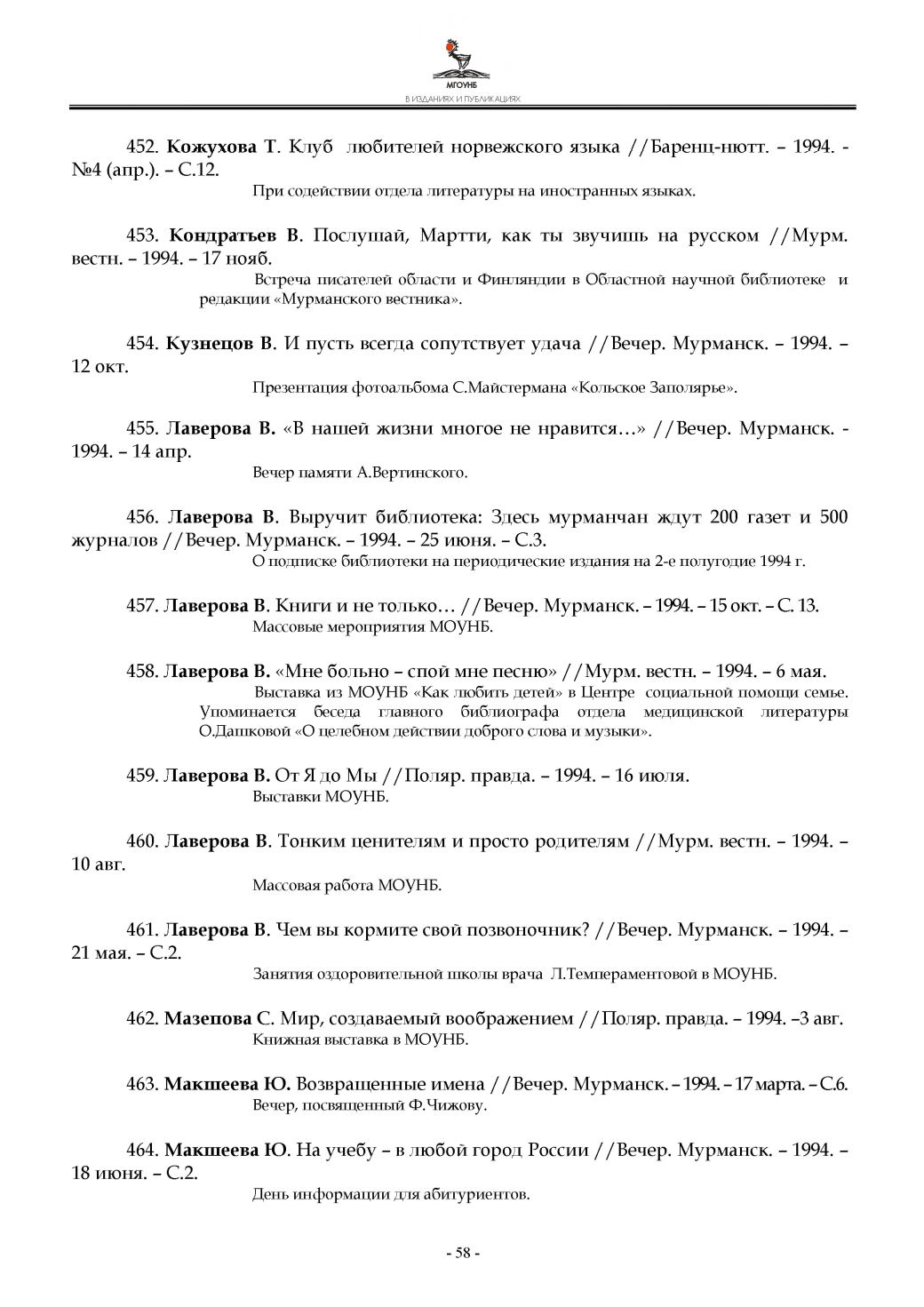 458. Лаверова В. «Мне больно - спой мне песню» //Мурм. вестн. - 1994. - 6 мая.