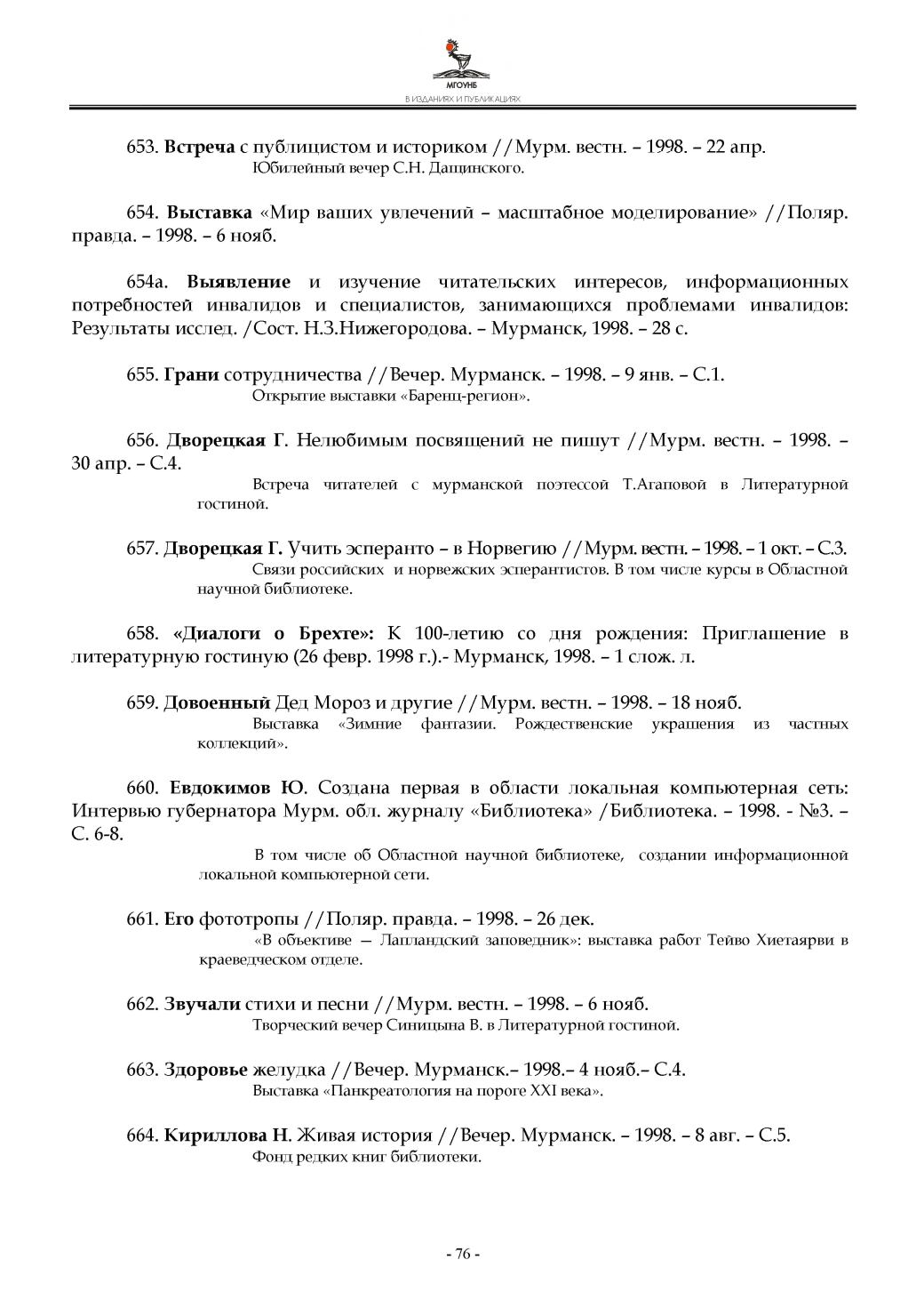664. Кириллова Н. Живая история //Вечер. Мурманск. - 1998. - 8 авг. - С.5.