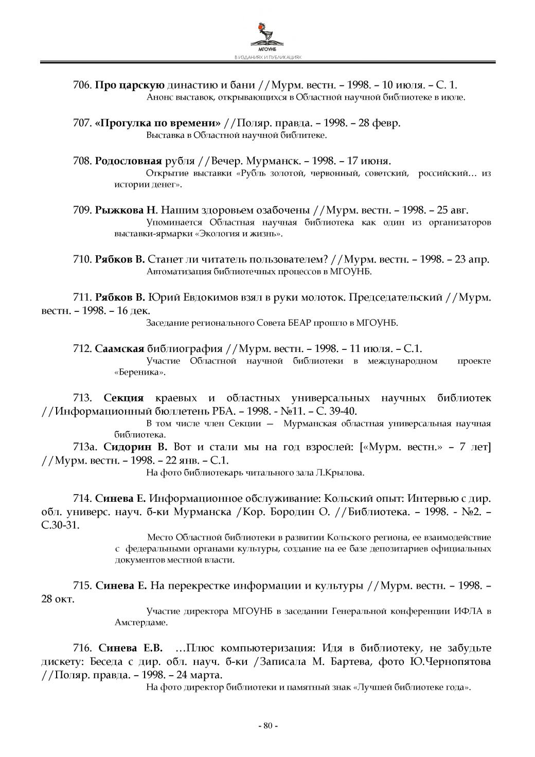 715. Синева Е. На перекрестке информации и культуры //Мурм. вестн. - 1998. -