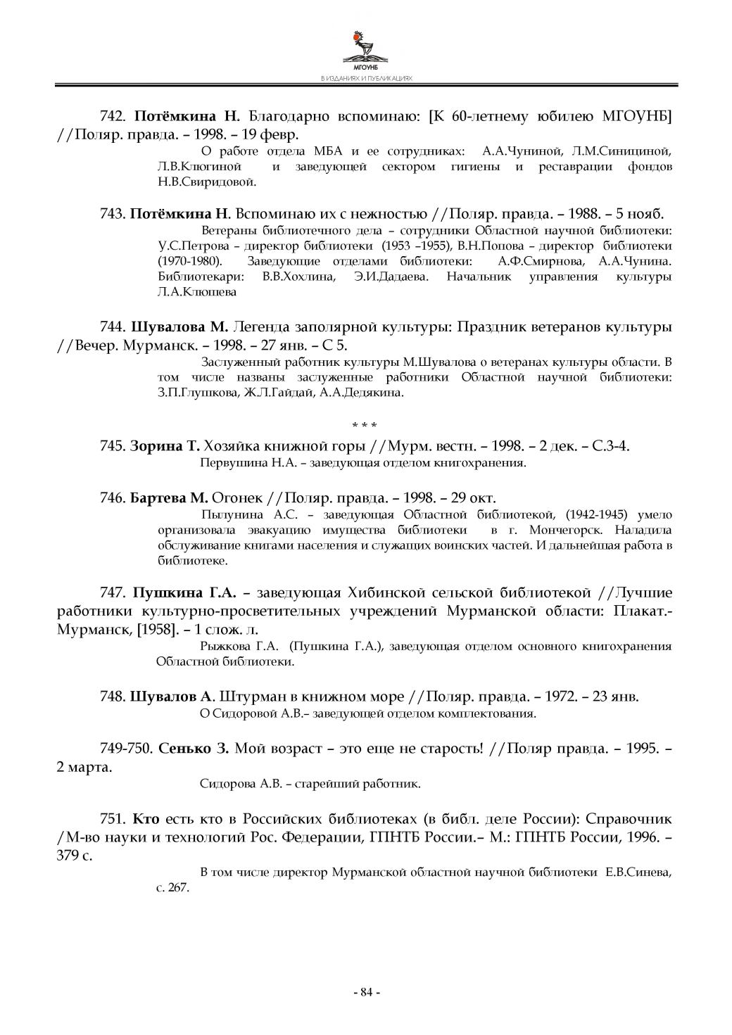 742. Потёмкина Н. Благодарно вспоминаю: [К 60-летнему юбилею МГОУНБ]