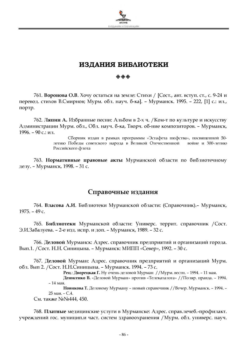 764. Власова А.И. Библиотеки Мурманской области: (Справочник).- Мурманск,