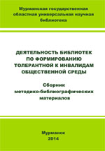 Деятельность библиотек по формированию толерантной к инвалидам общественной среды: сб. методико-библиографических материалов / Мурм. гос. обл. универс. науч. б-ка ; [сост.: Гайдай В.А.; ред. : Мудревская Е.Н.]. – Мурманск, 2014. – 106 с.