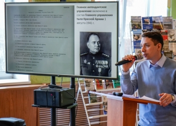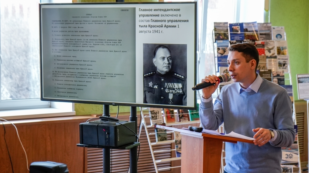 3 апреля 2026 года в Мурманской областной научной библиотеке в рамках патриотического проекта «Моя страна – моя Россия» и подготовки к «Диктанту Победы» состоялась лекция «Продовольственная служба Красной Армии в годы Великой Отечественной войны». Лектором выступил Павел Чунин, ассистент кафедры истории Мурманского арктического университета, специалист по экспозиционно‑выставочной работе Мурманского областного краеведческого музея.