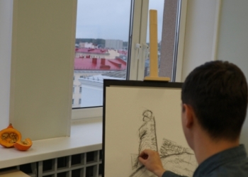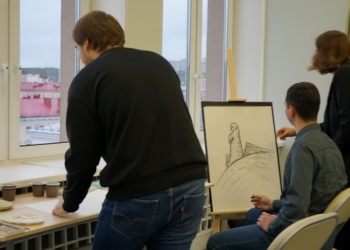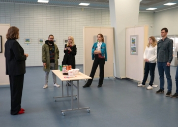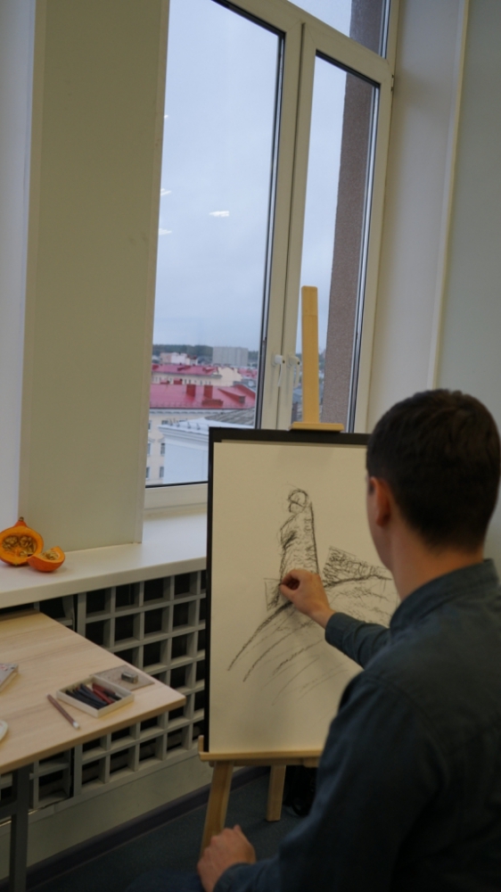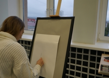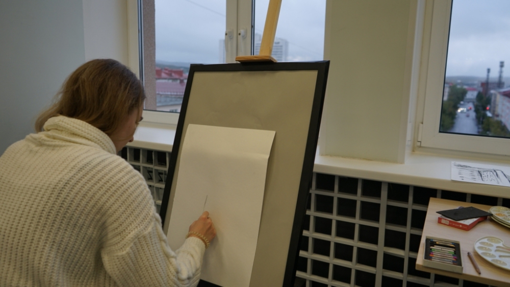 На открытии Илона Голуда провела быстрый пленер, предложив гостям самостоятельно нарисовать фирменный вид из окон Мурманской областной научной библиотеки. Для этого были подготовлены акварель, пастель, уголь и пара мольбертов, на которых гости и учились рисовать под чутким руководством художника.