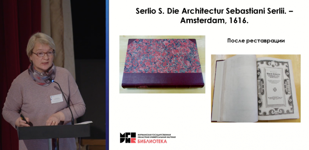 Елена Кузнецова выступила с докладом-презентацией «Западноевропейская книга XVII–XIX вв. из фондов Мурманской государственной областной универсальной научной библиотеки как объект изучения и реставрации», в котором особое внимание уделила иностранным изданиям из фонда редких книг библиотеки, прошедшим реставрацию в ведущих российских Центрах консервации и реставрации документов.