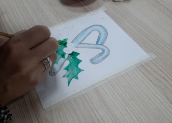 На занятии ребята сделали новогоднюю открытку в технике акварель. Работа выполнялась поэтапно: сначала был нанесён эскиз задуманного рисунка, затем происходила заливка фонового цвета и деталей. Необходимо было использовать много воды, чтобы передать воздушность и легкость изображения.