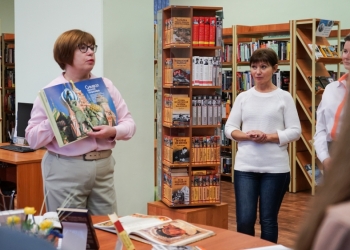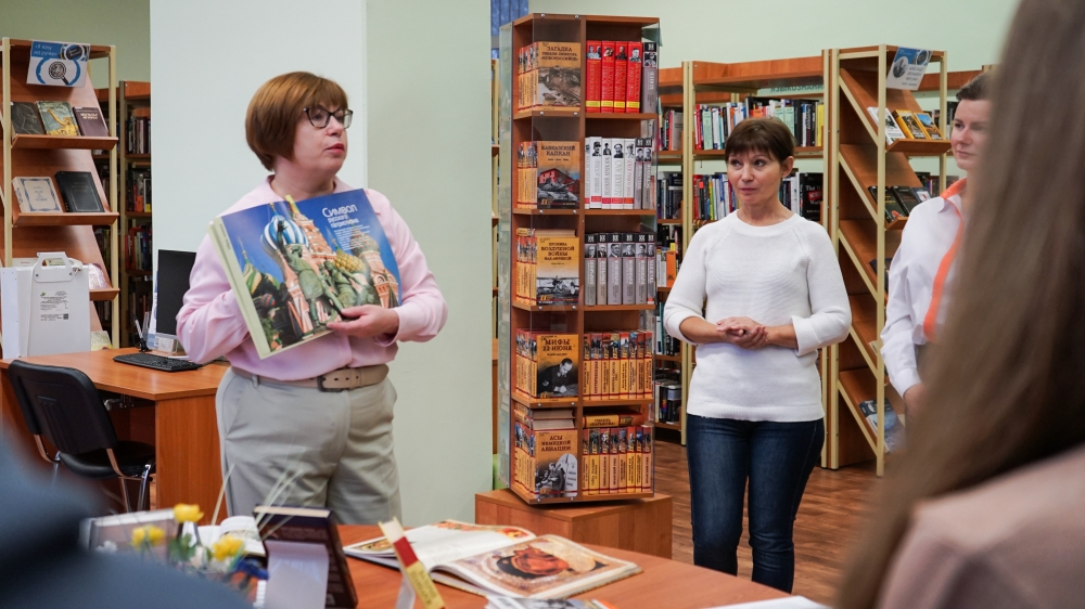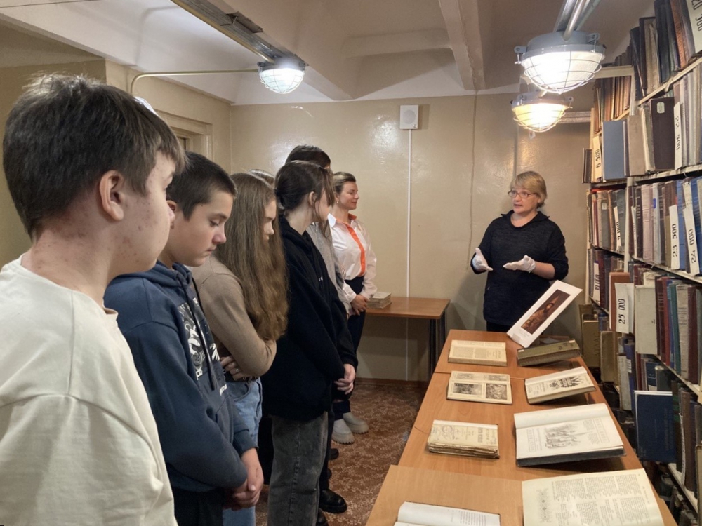 На экскурсии по книгохранению школьники увидели редкие книги. Среди изданий были продемонстрированы труды известных историков Сергея Соловьева, Николая Карамзина, Николая Костомарова, изданные до 1917 года, и самая старая книга в библиотеке на русском языке с текстами указов Петра I.