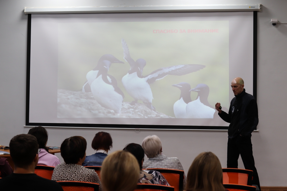 Лектором выступил Алексей Ежов, орнитолог, специалист по морским птицам Арктики, научный сотрудник Мурманского морского биологического института РАН и Кандалакшского государственного заповедника.
