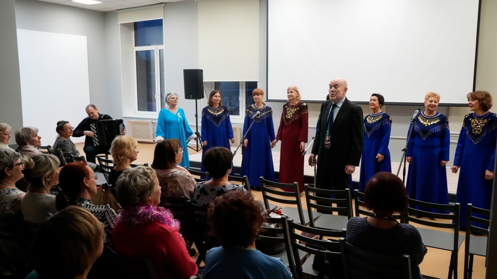 Праздничную программу для клуба «Старшие» продолжил концерт Народного самодеятельного коллектива «Хор ветеранов «Встреча друзей». Прозвучали новые и хорошо знакомые новогодние песни.