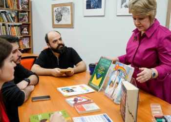 Встреча началась с небольшой экскурсии по библиотеке. Присутствующие узнали, сколько лет научной библиотеке, что такое «Площадь Первоучителей», а также посетили залы обслуживания, увидели интересные арт-объекты МГОУНБ.