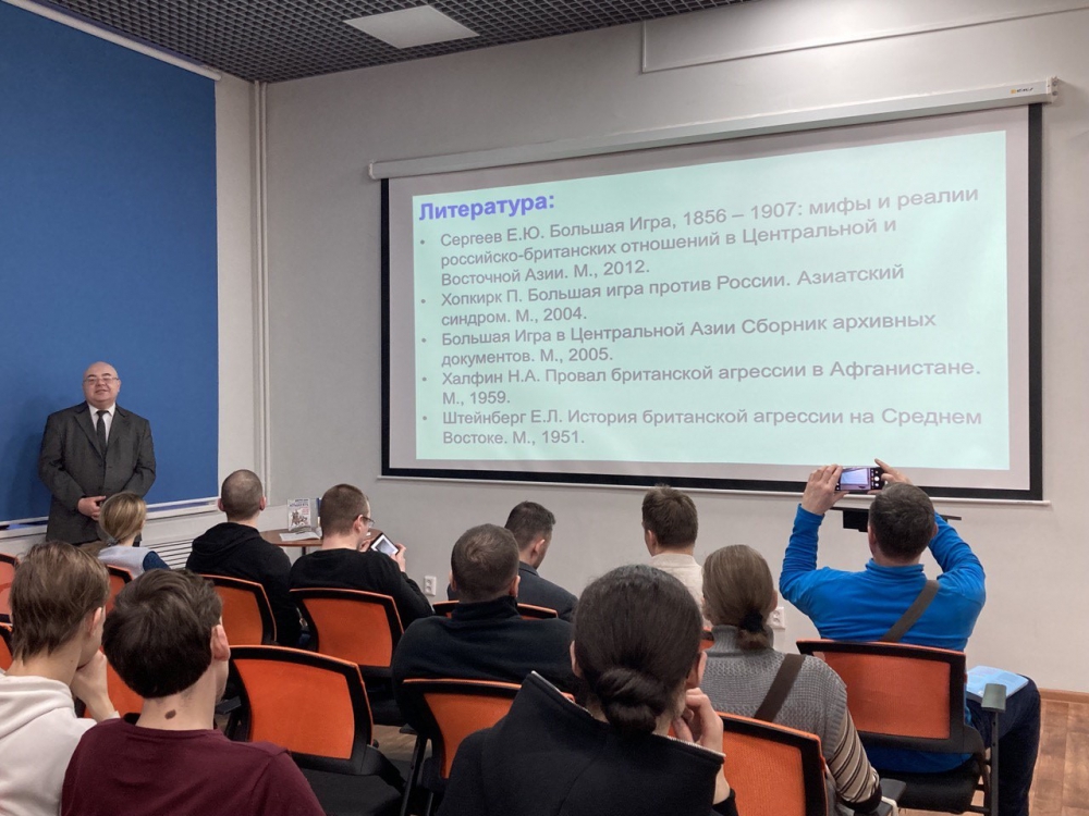 Кандидат исторических наук, доцент кафедры истории и права, почетный работник сферы образования Российской Федерации Владислав Владимирович Кузь прочитал лекцию «Алмаз за кровь»: начало Большой игры (конец XVIII – первая половина XIX вв.)»