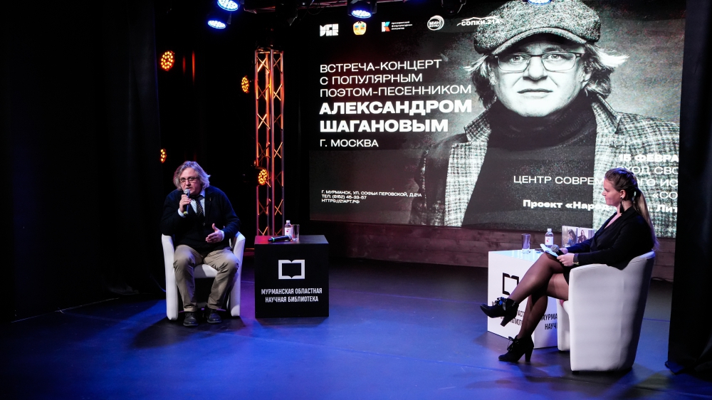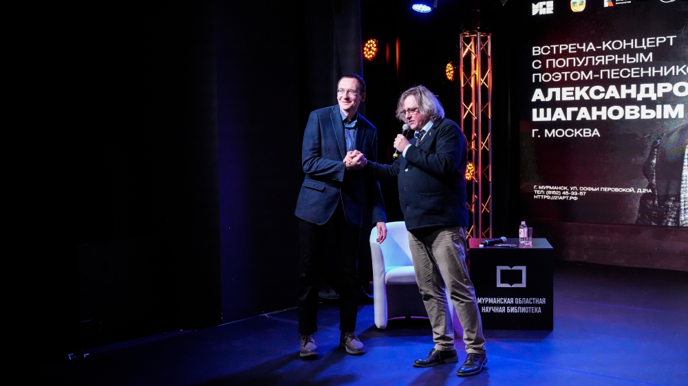 Во второй части вечера Александр Алексеевич исполнил свои хиты, собранные в попурри («Там, за туманами», «Конь», «Хорошая, родная» и другие), а также прочитал стихи о войне. В завершение концерта поэт подарил мурманской Научке свою книгу «Я Шаганов по Москве» и провел автограф-сессию.
