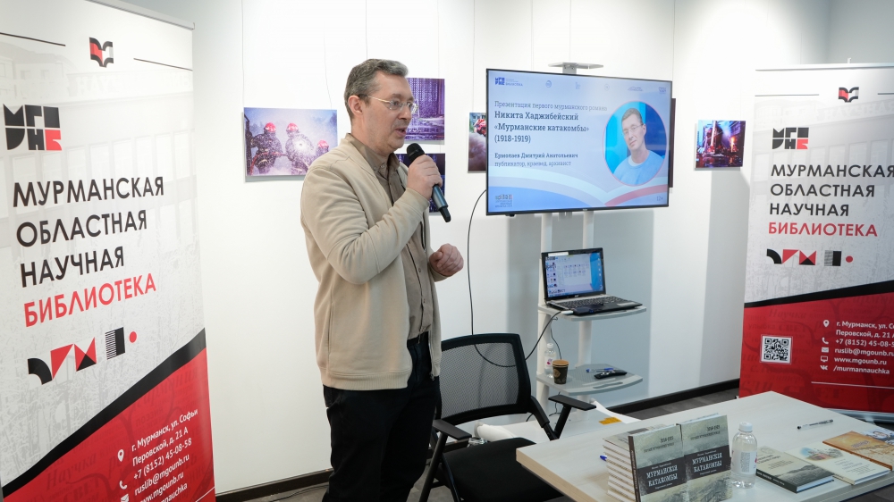 На ярмарке состоялась презентация первого мурманского романа Никиты Хаджибейского — «Мурманские катакомбы». Читающей публике его представил Дмитрий Ермолаев, публикатор, краевед, архивист.