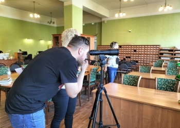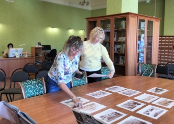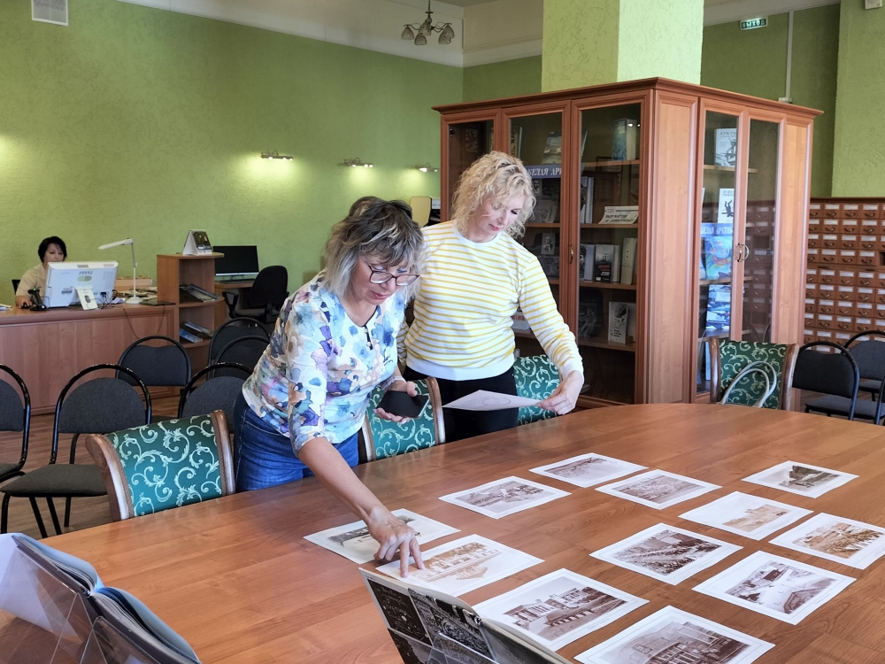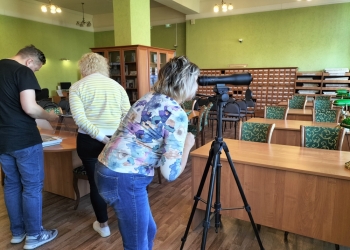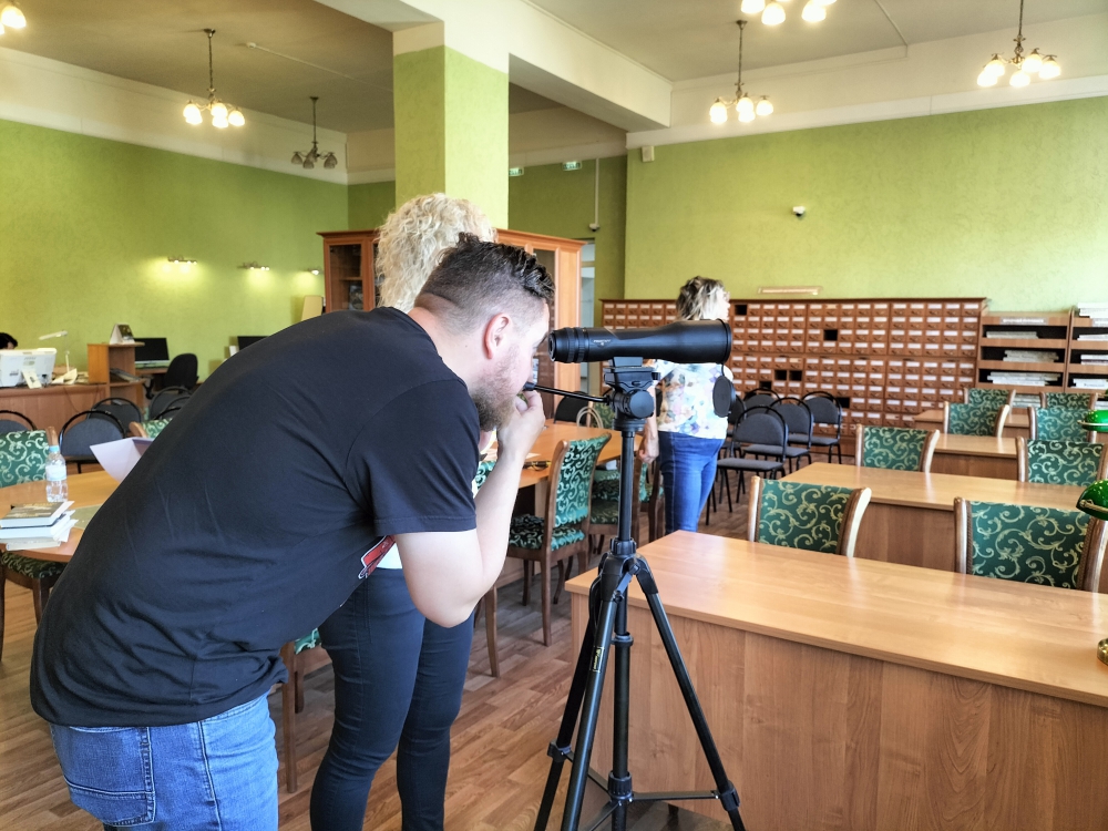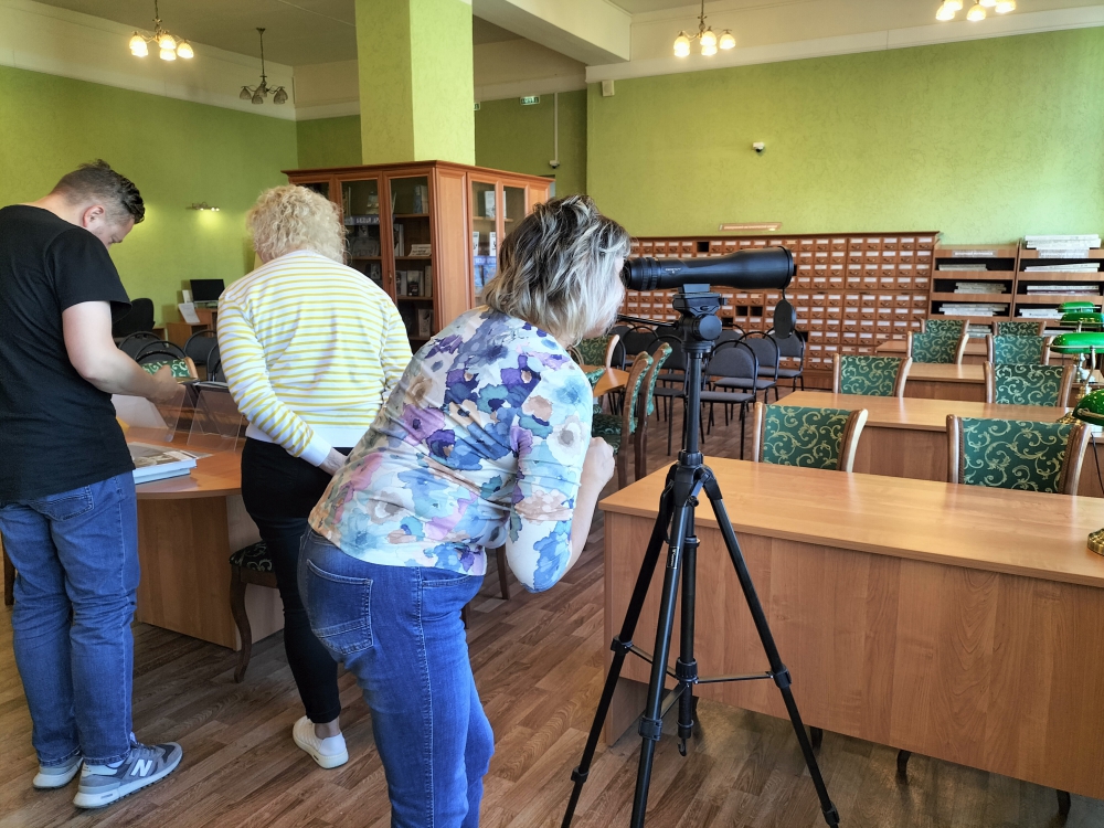 В завершении экскурсии ее участники с интересом рассматривали Мурманск в старых фотографиях, а также увидели здания и памятники в подзорную трубу с высоты четвертого этажа библиотеки.