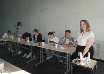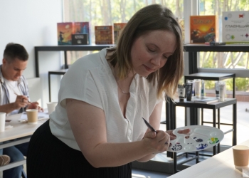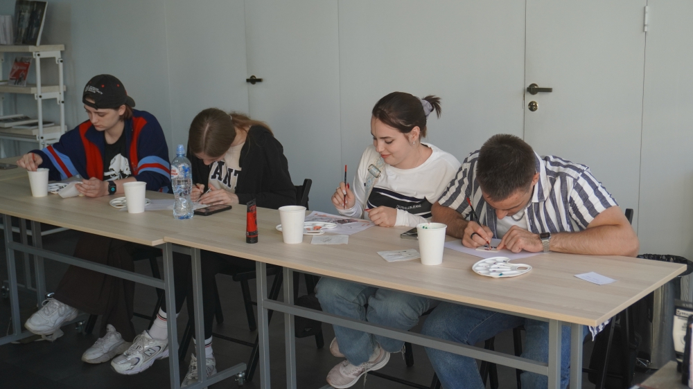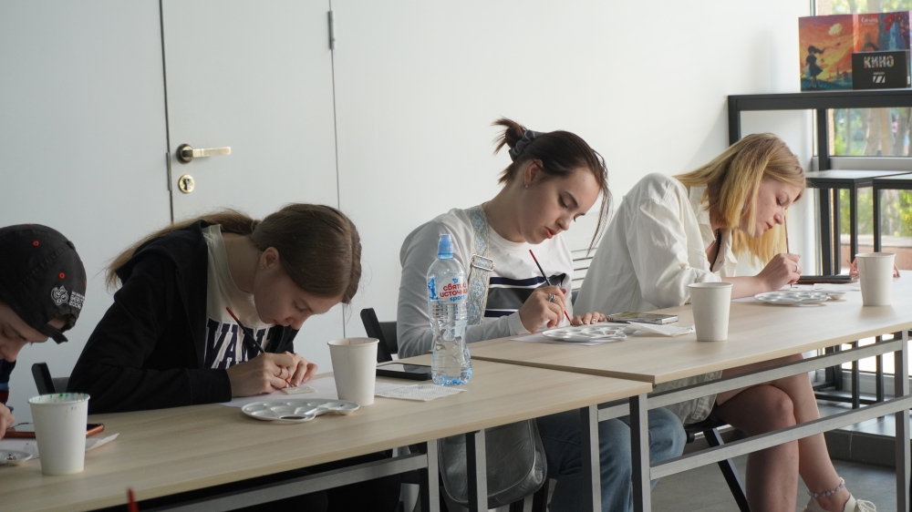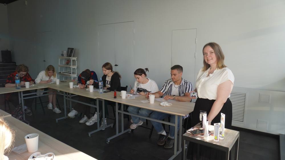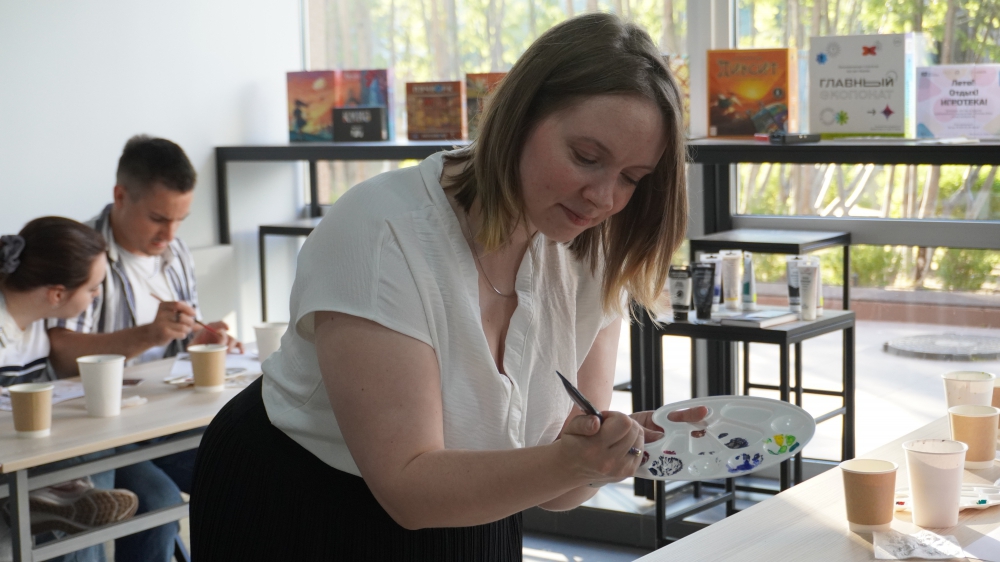 Специалист отдела информации по культуре и искусству Шохова Юлия рассказала, как работать с акриловыми красками и помогла участникам завершить работу.