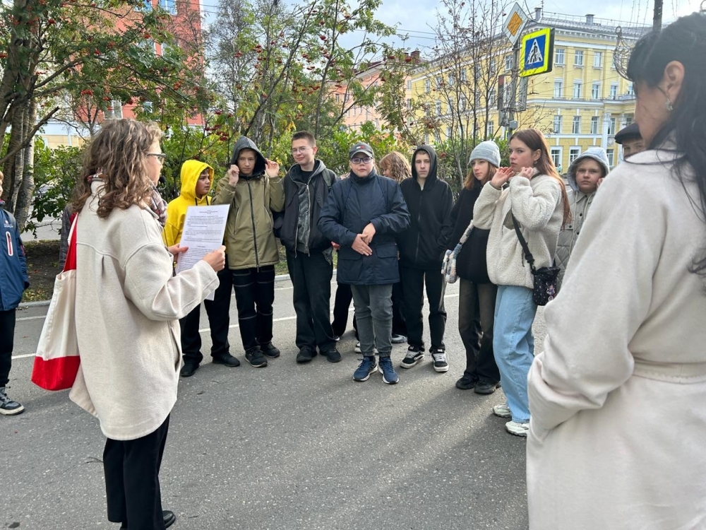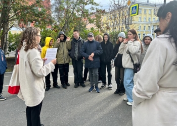 Несмотря на холодный ветер и непогоду учащиеся Мурманского академического лицея совершили часовую прогулку по городу и услышали о советских писателях, поэтах и журналистах, побывавших в Мурманске и оставивших свои воспоминания о нем.