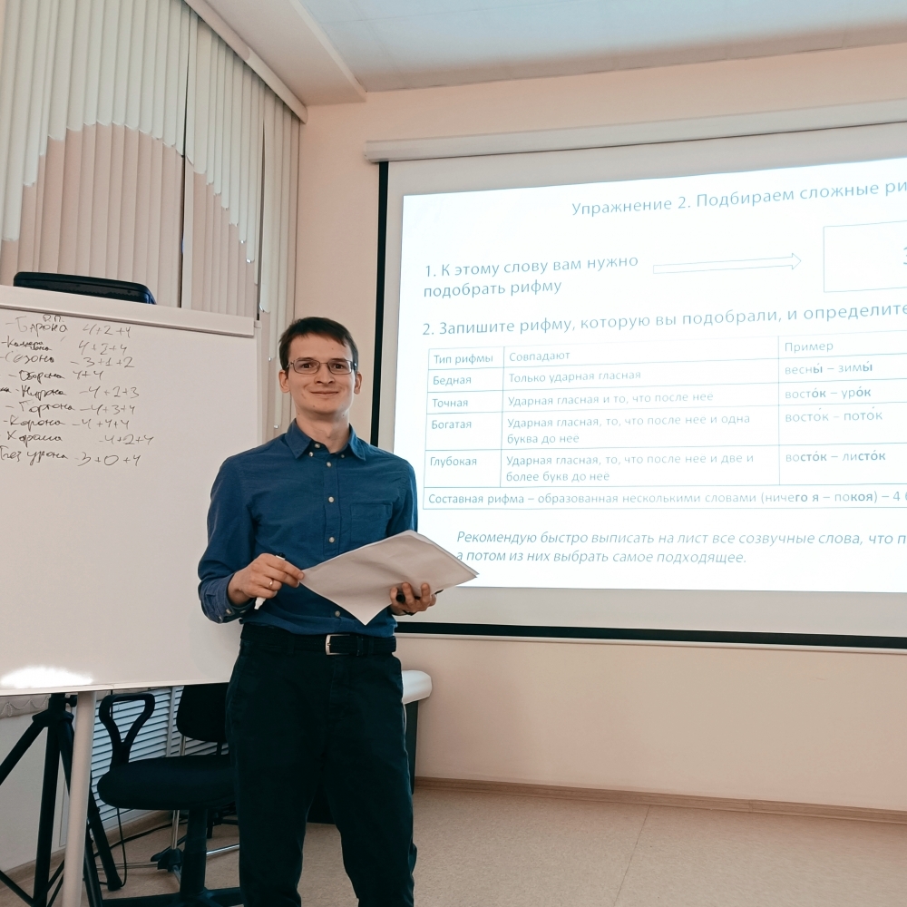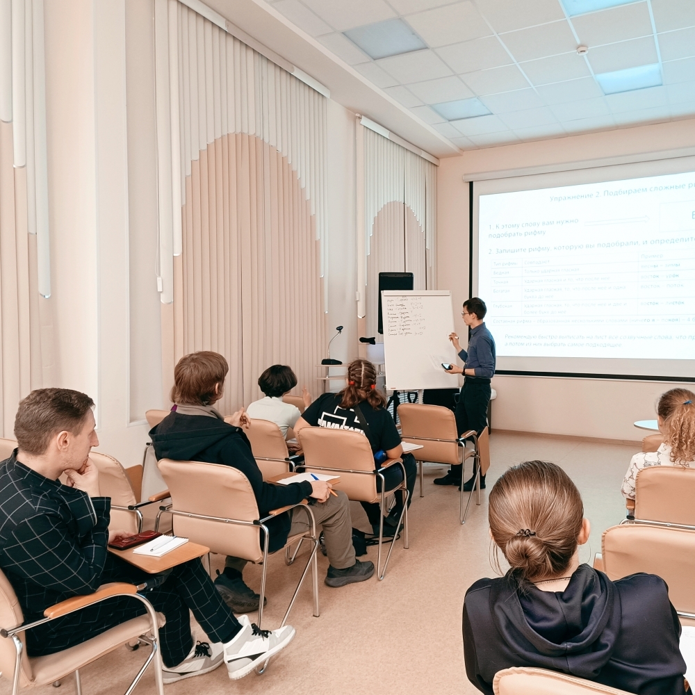 В рамках мероприятия рассматривалась теория образования рифмы, то, как определить бедная она, точная, богатая или глубокая. Разбирались особенности составных рифм. Практическое задание предлагало составить рифмы к сложным словам, среди которых – «зеркало». Участники встречи узнали, что единственной рифмой к нему считается «исковеркало».