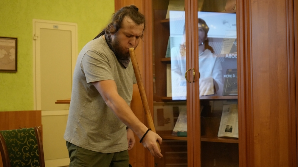 С Олегом Арсеньевым, мастером художественной резьбы по дереву из Вологды, Павел Широглазов показал небольшую театрализованную программу по поэме «Босиком за белым светом». Постановка создана по одноименной поэме, впервые представленной в полном объеме в книге «Небесный почтальон». В театрализованной программе прозвучали народные инструменты: гусли, калюка и варган.