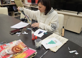 Специалист Научной библиотеки Яковлева Виктория поделилась секретами работы в технике коллажа. Участники научились комбинировать разные текстуры и цвета, создавая оригинальные композиции.