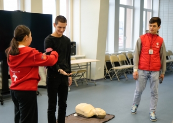 Школьники на практике изучили правильное наложение жгутов при венозном и артериальном кровотечении, использование метода Геймлиха в случае закупоривания дыхательных путей, на манекене потренировались в оказании первой помощи при обмороке, остановке сердца. Участники мастер-класса «Первая помощь» узнали, что эти меры проводятся до прибытия медицинского работника или доставки пострадавшего в лечебное учреждение.