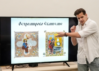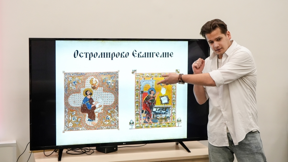 Урок-лекция «Древнерусская книжная миниатюра» напомнил о традиции украшать книги сюжетными иллюстрациями, буквицами и орнаментами, которые пришла на Русь из Византии.